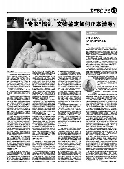 在整个国内文物鉴定市场上,鉴定专家的问题只是一个方面,正如贾文忠所言:“文物鉴定市场的乱不仅仅只出在鉴定家上,古玩出版业也很乱。因为传媒出版业很发达,很多人甚至拿着杂志、书本去市场上买东西。但是问题在于,现在出版信息都很混乱,有的甚至是错误的。只要有书号就能出书,根本无人审核。现在文物界唯一能相信的出版物就是《考古发掘报告》。”贾文忠指出,文物鉴定市场之乱并非仅体现在一个方面,而是呈现出链条式的连带关系,比如出版业、拍卖业、传媒业等。