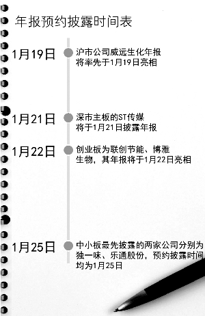 沪深证券交易所日前分别在其网站发布了《关于做好上市公司2012年年度报告披露工作的通知》以及年报预约披露情况表。根据安排,沪市公司威远生化将率先披露2012年年报,披露时间为2013年1月19日。深市主板的ST传媒将于2013年1月21日披露2012年年报;中小板最先披露的为独一味、乐通股份,预约披露时间均为2013年1月25日,创业板为联创节能、博雅生物,其2012年年报将于2013年1月22日亮相。