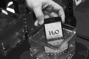 能否只带一样东西,却拥有所有功能?手机更大,平板更小,“手机平板”一词应运而生。本届消费电子展上就将展示更多大型手机。例如,华为Ascend Mate采用6.1英寸屏,将是此次展会上最大的一款手机。华为也想借这款智能手机挑战三星和苹果。眼下,智能手机和平板电脑是销售增长最快的产品,围绕它们做文章总没错,就算巨屏引不起你的兴趣,那么这款防水手机可谓史无前例。图为一名工作人员将一个智能手机浸入啤酒中,以展示HzO公司的Water Block防水技术。