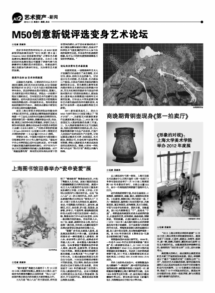 在岁末年初的各种论坛中,由M50创意新锐评选发展而来的“2012年度(第6届)Creative M50创意新锐评选”之青年艺术家发展论坛暨颁奖典礼颇有新意。主办方上海纺织时尚发展有限公司邀请了评委代表与各参赛学生所属的美术学院院长、各家画廊代表以及媒体代表举行论坛,关注青年艺术家的发展。