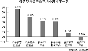 据海通证券数据显示,从权益型各类产品平均业绩排序来看,从高到低分别是:公募股票型基金5.66%、公募混合型基金3.99%、私募TOT产品3.17%、私募非结构化产品3.11%、券商股混型产品0.77%、券商FOF产品-0.73%。