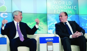 图为瑞银集团董事会主席阿克塞尔·韦伯(右)与美国摩根大通银行首席执行官詹姆斯·迪蒙在论坛上交流。
