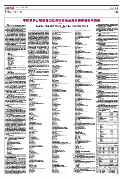 本摘要根据《中欧鼎利分级债券型证券投资基金基金合同》和《中欧鼎利分级债券型证券投资基金更新招募说明书》编写,并经中国证监会核准。基金合同是约定基金当事人之间权利、义务的法律文件。基金投资人自依基金合同取得基金份额,即成为基金份额持有人和本基金合同的当事人,其持有基金份额的行为本身即表明其对基金合同的承认和接受,并按照《基金法》、《运作办法》、基金合同及其他有关规定享有权利、承担义务。基金投资人欲了解基金份额持有人的权利和义务,应详细查阅基金合同。