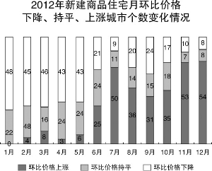 刘建伟则预计,因市场供应较为充足,未来房价走势有望趋稳。数据显示,2013年城镇保障性安居工程将基本建成近500万套、新开工600多万套。统计资料还显示,截至2012年底,全国住宅待售面积为2.36亿平方米,同比增长30.6%。若按照2012年全年销售9.85亿平方米,月均销售0.8亿平方米的规模估算,库存的2.36亿平方米待售面积可销售近3个月。