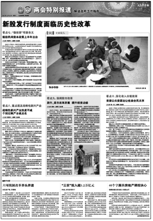 2011年两会期间,本报推出“展望积极的股市政策”,呼吁给予资本市场改革发展更多顶层设计,推出更有助于资本市场稳定健康发展的政策措施,引发各界代表委员热烈讨论。2012年全国两会期间,我们又进一步推出“敢问市场改革发展路在何方”系列报道,聚焦发行改革、分红、退市、债券、期货创新、投资者保护、法制建设等七大改革关键词,同样引发业界热议。
