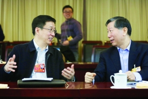 3月7日,中国银监会主席尚福林(右)参加上海代表团讨论,与上海市委书记韩正交流上海国际金融中心建设。尚福林说,上海在国际金融中心建设方面,已经取得长足进步。银监会将一如既往地支持上海国际金融中心建设。记者 史丽 摄