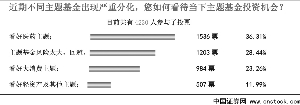 数据统计显示,有1536名网友投票选择了“看好医药主题”,选择该选项的网友人数占所有参与投票总人数的36.31%,显示“强身健体”主题目前所具有的较高人气;同时,也有1203名网友表示“主题基金风险太大,回避”,选择该选项的网友人数占所有参与投票总人数的28.44%;选择“看好大消费主题”的有984人,占比23.26%;还有507人选择了“看好轻资产及其他主题”,占所有参与投票总人数的11.99%。