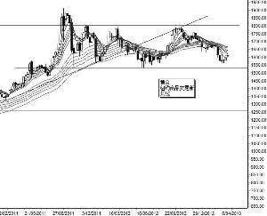 对于纽约商品交易所黄金价格来说最重要的数字是1540美元和1800美元,因为黄金价格反弹持续的可能性不大。交易带的上轨位于1800美元附近的强压力位附近。这个压力区域在2011年11月、2012年3月和2012年10月经受过试探。1540美元是在2011年10月和2012年5月受到过试探。它在2011年6月起到过压力位的作用。这是长期横向交易带的下轨,自从2011年10月就已经存在。这个交易带在2010年9月金价在1924美元附近达到高峰后形成。