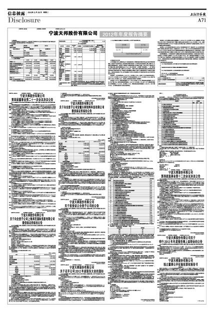 宁波天邦股份有限公司将于2013年4月1日(星期一)下午15:00—17:00 在深圳证券信息有限公司提供的网上平台举行2012年年度报告网上说明会。本次说明会将采用网络远程方式举行,投资者可登陆投资者互动平台:http://irm.p5w.net 参与本次说明会。