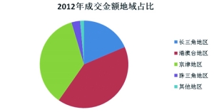 2012年,中国内地及港澳台地区共有47家拍卖行进行了油画拍卖。从拍卖行的数量和成交金额看,京津地区、港澳台地区和长三角地区形成三足鼎立的状态,这三个地区的成交额占全国成交额的95.42%。港澳台地区举行油画拍卖的公司数量不足京津地区的一半,但是成交总额却超过了京津地区。