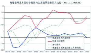 世界艺术品拍卖市场依然受到世界经济不确定性的影响,梅摩全球艺术品综合指数在2013年第一季度下跌5.8%。从2012年年中到2013年一季度,标普500指数和富时指数的涨幅超过了11%,远优于同期艺术品市场的表现。我们根据3月份全球范围内苏富比和佳士得的18场拍卖会的成交数据,共整理出167对新增的重复拍卖。这些重复拍卖使我们计算出了3月份的梅摩全球艺术品综合指数。梅摩指数研究中心
