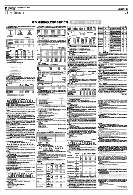 烽火通信科技股份有限公司(以下简称“公司”)第五届董事会第五次会议于2013年4月18日在烽火科技大厦四楼一号会议厅召开。会议决定召开2012年年度股东大会,现将有关事项公告如下: