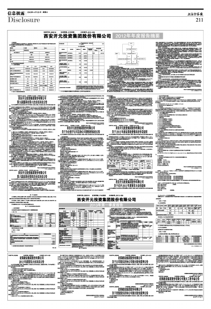 西安开元投资集团股份有限公司董事会于2013年4月8日以书面方式发出召开公司第九届董事会第六次会议的通知,并于2013年4月18日在公司总部会议室以现场表决形式召开。会议应到董事11人,实到董事11人,公司监事会成员列席了会议。会议的召开符合有关法律、法规、规章和《公司章程》的规定。会议由王爱萍董事长主持。