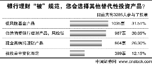 上周,中国证券网进行了“银行理财‘被’规范,您会选择其他替代性投资产品”的网络互动调查,投票结果或许暗示,由于相关银行理财产品的收益率存在下降可能,诸如基金等替代产品成为资金的新流向地。