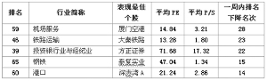机场服务排名大幅下降,上周排名第59名,较前周下跌28名,成为上周排名下降幅度最大的行业。数据显示,4月上半月行业旅客增速显著低于运力增长,在行业座位数增长13.3%的背景下,旅客流量增长仅有10%,客座率同比下降2个百分点,内线裸票价格比去年同期下降超过10%。第一创业证券分析师张庆表示,进入4月中下旬,公商务旅客出行平稳,从5月初欧美澳的国际订座数据来看,国际旅客出行态势较好。由于中国民航2013年整体运力投入同比增长11.4%,将确保主要机场的起降架次同比增速。4月初禽流感对华东地区的始发客流有所抑制,但整体对机场的影响较小。预计未来两年机场的业绩仍能稳健增长,从历史股价表现来看,机场股在弱市不但能跑赢大盘,还有绝对收益。目前国内上市机场公司对应于2013年平均PE为10.6倍、PB为1.3倍。维持机场业“强于大市”评级,首选折旧趋于稳定、内航外线提价最为受益的上海机场,同时积极关注厦门空港和白云机场。