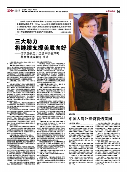 亨奇:我依然看好美国股市,主要基于三方面的动力。首先是房地产市场的复苏及其对相关行业的带动;其次是页岩气革命;第三是并购活动活跃。