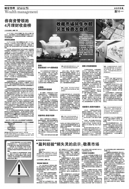 从3月下旬至4月底,股市震荡下跌,沪深300指数下降6%以上。统计数据显示,在外部市场震荡走低的情况下,在大类权益类投资产品中,券商集合理财表现最好,公募基金居中,而私募业绩最弱。