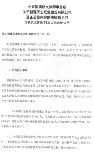 公司在《上海证券报》刊载的公告中,2013年5月11日公告的《新疆天宏纸业股份有限公司2013年第二次临时股东大会决议公告》,经事后审核,公告中有关参加网络投票的股东代表股份数及占总股本比例表述有误,以及本次股东大会经北京市国枫律师事务所名称有误。现更正如下: