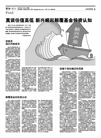 最近三年以来A股结构性行情一次又一次提醒了投资者对经济结构转型的关注,反映在2013年股市投资者中,周期抑制、新兴崛起的现实完全颠覆了基金经理传统的投资认知。面对新兴成长的快速崛起,高估值不应是研究成长投资的障碍。