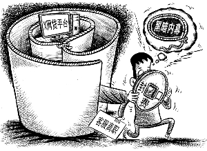 某网贷平台的年利息在22%至24%上下,如遇特殊情形,会再提升至26%至32%。但近两个月没接过一个单子,而平台的银行账户在还款高峰时每次都会被提空,有的客户因此无法提现。为保住秘密,员工离职时收到了老板的万元“封口费”。漫画 刘道伟