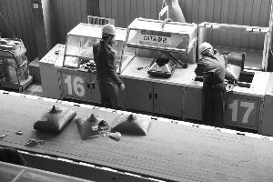 与一号车间主要依靠工人拆卸不同,二号车间开始使用大型机器。记者看到,电视机被送上流水线之后,先是被卸掉显像管,然后直接送进一台粉碎机,通过电子显示屏可以清楚地看到整个粉碎过程,一台去除显示屏的电视机在几秒钟内即被粉成碎片。周继锋介绍,粉碎出来的碎片直径可以调节,目前控制在1.5厘米左右。
