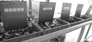 在二号车间的一个角落,记者看到了被拆解下来的显像管,现场操作人员将其放进一个大箱子,周继锋介绍,这是在利用负高压回收里面的荧光粉。