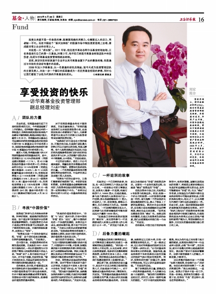 当记者最后抛给刘宏一个问题“如果不做投资,你会做什么?”的时候,坐在记者对面的他愣了一下,然后笑着回答:“我从来没想过,一直以来,投资之于我并不是一份工作,而是一份事业,我喜欢而且愿意一直做下去,在寻找‘牛股’的过程中,我也在享受着快乐。”