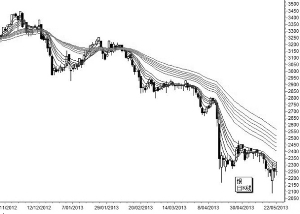 白银价格图上有两个关键的特征。第一个特征是顾比复合移动平均线指标(GMMA)的关系。它们显示出一个已经确立的下降趋势。短期组均线反映了交易者的行为。宽阔的发散显示出交易者是卖出者,他们在白银上做空。长期组均线显示了投资者的行为。他们也是卖出者,正如GMMA长期组指标所显示的那样。结论是,这是一个下降趋势,形成可持续的反转的可能性不大。