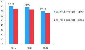 相关数据显示,今年上半年,宝马品牌全球销量为804248辆,同比增长7.7%;奥迪销量为780500辆,同比增长6.4%;奔驰销量为694433辆,同比增长6.4%。在2013年1月至6月的月度排名中,宝马曾四个月问鼎全球豪华车销量冠军,奥迪曾2个月问鼎全球豪华车销量冠军,奔驰从未登上月度销量冠军榜。