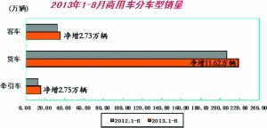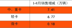 商用车虽然增速有所回落,但仍走在慢速回升的道路上。8月商用车产销分别完成28.94万辆和29.57万辆,比上月分别增长1.7%和6.1%,比上年同期分别增长6%和7%。商用车6月产销比上年同期分别增长14.4%和19.5%,7月产销比上年同期分别增长12.8%和7.5%,与之相比,8月增速继续回落。在商用车中半挂牵引车产销比上月和上年同期增长20%以上,增长最为明显。据中国汽车工业协会统计,1-8月商用车产销分别完成266.11万辆和269.16万辆,比上年同期分别增长8.4%和6.8%,产量增速比前7个月略有回落,销量增速基本持平。在商用车品种中,半挂牵引车产销增速分别为27%和21.3%,增速比前7个月继续提高;客车和货车增速有所回落;货车非完整车辆增速高于前7个月水平;客车非完整车辆低于上年同期。