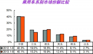 1-8月,中国品牌轿车共销售203.52万辆,同比增长12.01%,占轿车销售总量的26.85%,占有率比上年同期增长0.44个百分点。德系、日系、美系、韩系和法系轿车分别销售193.76万辆、129.60万辆、120.44万辆、76.21万辆和32.14万辆,占轿车销售总量的25.56%、17.10%、15.89%、10.05%和4.24%。此外,从1-8月主要外国品牌轿车销量比上年同期增长情况分析,日系下降11.2%,降幅比前7个月有所扩大;德系、美系、韩系和法系增速均高于行业整体增速。德系、日系、美系、韩系和法系轿车1-8月累计市场份额分别为25.6%、17.1%、15.9%、10.1%和4.2%。