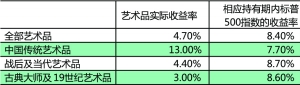 2013年第三季度,除了中国传统艺术品,其他类别艺术品的实际收益率都要低于历史平均水平。战后及当代艺术的实际收益率比历史平均下跌了60%,而古典大师及19世纪艺术品也有50%的下跌。这些结果进一步证明了艺术品市场在2013年第三季度的疲软。另外,标普500指数已经接近了历史高点,但艺术品综合指数和各分类指数远远低于它们分别在2007、2008和2011年创造的历史高点。