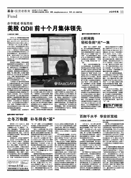 在政府赤字缩减、三季报业绩普遍超预期等有利因素推动下,标普500和道琼斯指数近期创出历史新高,纳指也创出近13年的最高纪录。今年前十月,跟踪美股的指数型QDII水涨船高。根据海通证券的最新统计数据,广发、国泰、博时、大成旗下跟踪纳斯达克100和标普500指数的QDII,包揽了复制股票指数型QDII业绩榜前五名中的四席,其中,广发纳指100的回报率达到了22.83%。