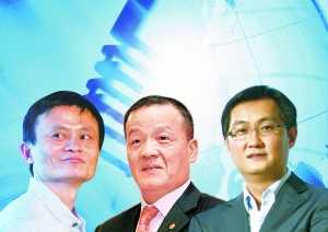 6日,穿着黄色毛衣的马云、外穿深色夹克内着白衬衣的马化腾和身着正装的马明哲,聚首复旦大学,为他们的跨界合作成果——众安保险开业。