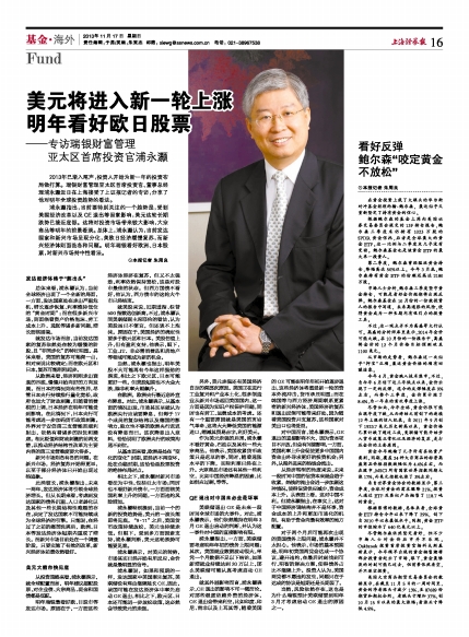 2013年已渐入尾声,投资人开始为新一年的投资布局做打算。瑞银财富管理亚太区首席投资官、董事总经理浦永灏近日在上海接受了上证报记者的专访,分享了他对明年全球投资趋势的看法。