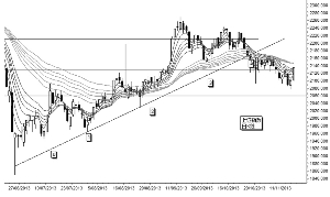 投资者将寻找下降趋势结束的形态形成的情况。这些形态包括:1、在2060点至2130点之间横向盘整;2、碟形或圆弧底形态;3、相对强弱指标(RSI)背离形态;4、经典的GMMA趋势突破形态,对GMMA长期组形成三次试探。