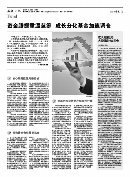“时值年底,行业间的估值差异开始收敛,受资金面紧张、IPO开闸等因素影响,风格切换成为现实。”海富通基金认为,从机构持仓来看,三季度公开数据显示机构对于成长股尤其是创业板的配置几乎达到历史高峰,也具备减仓空间。从业绩风险来看,明年1月中旬创业板股将迎来业绩快报公布密集期。从现在开始到明年,IPO都将是悬在市场头上的一把利剑,对于创业板、高估值股票来说构成持续压力。“种种因素决定,此前估值透支的成长股将面临估值回归过程,局部资金或将从高估值成长股转移向低估值大盘股,因此将对股指形成一定支撑力量。”