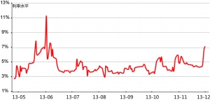 其三、银行间市场的涨幅不可同日而语。6月20日,7天回购加权平均利率飙涨11.62%,隔夜回购利率至11.74%,而此轮银行间市场利率上升,无论是绝对值还是相对涨幅,都远低于6月份“钱荒”时的水平。12月19日,7天和隔夜回购加权平均利率虽为本轮最高水平,但仅分别为7.05%和4.61%。