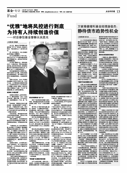 二季度以来,唐俊杰管理的一级债基万家稳健增利二季度开始大幅降低仓位和债券久期,替代一些比较安全的投资对象,比如同业存款、逆回购,以及短久期高评级的品种,正是这些措施很好地规避了今年债市估值的损失。
