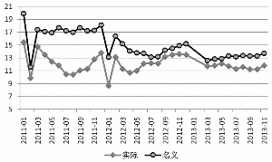 一是 “八项规定”对餐饮消费影响减弱。2013年以来,中央提倡勤俭节约,严格公务消费有效抑制了公款吃喝,1-11月餐饮收入增长9%,增幅同比放缓3.4个百分点,下拉社会消费品零售总额增速0.4个百分点左右。特别是限额以上企业餐饮收入下降1.6%,降幅较深。