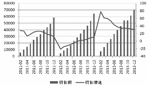 2013年以来,作为消费主导市场的房地产市场销售呈现火爆局面。1-11月份,我国商品房销售面积同比增长20.8%,其中住宅销售面积增长21.2%,分别较上年同期提高16.4和18.9个百分点;商品房销售额增长30.7%,增幅同比提高21.6个百分点。商销售的火爆进一步推高房地产价格,按商品房销售额和销售面积计算的全国商品房价涨幅达到8.1%,同比加快1.5个百分点。