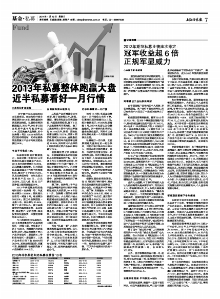 私募排排网统计数据显示,在成立满一年的929只非结构化私募证券基金产品中,2013年平均收益率为12.95%,远远跑赢大盘指数,但与同期公募基金超过17的平均收益相比,落后于4个多百分点%。从具体表现来看,全年实现正收益的产品728只,占比78.36%,几近八成,有25只产品净值上涨幅度超越50%。