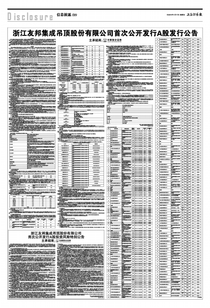 浙江友邦集成吊顶股份有限公司首次公开发行A股发行公告
