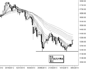 在黄金价格图上,压力为位于顾比复合移动平均线长期组的上边缘附近。这些平均线的上边缘位于1400美元附近。这也靠近黄金价格在2013年8月反弹的主要高峰。1400美元的位置也是2010年12月的压力位。1400美元的位置在黄金价格图上是一个强压力位。