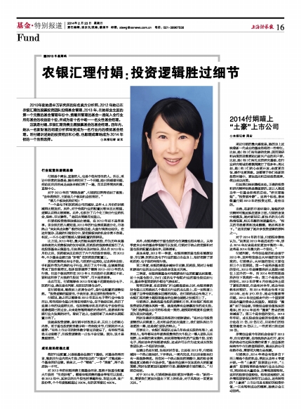 这就是付娟,农银汇理消费主题股票基金的基金经理。四年内,她从一名新财富的明星分析师转变成为一名行业内的绩优基金经理。听付娟讲述她的投资经历和心得,也顺理成章地成为2014年初的一个当然选择。