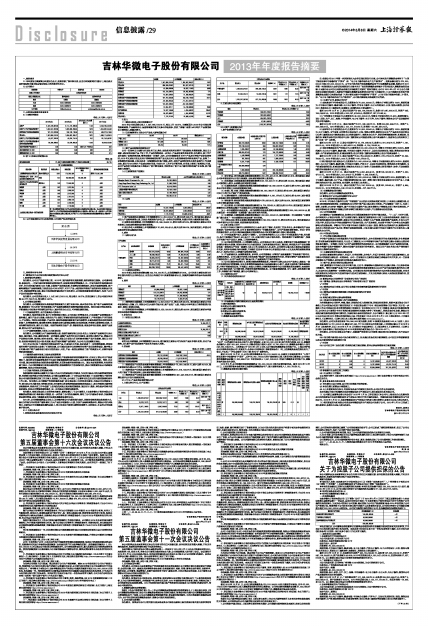 十九、审议通过《吉林华微电子股份有限公司关于召开2013年年度股东大会的议案》(详见刊登于《中国证券报》、《上海证券报》、《证券日报》、《证券时报》及上海证券交易所网站http://www.sse.com.cn的《公司关于召开2013年年度股东大会的通知》)