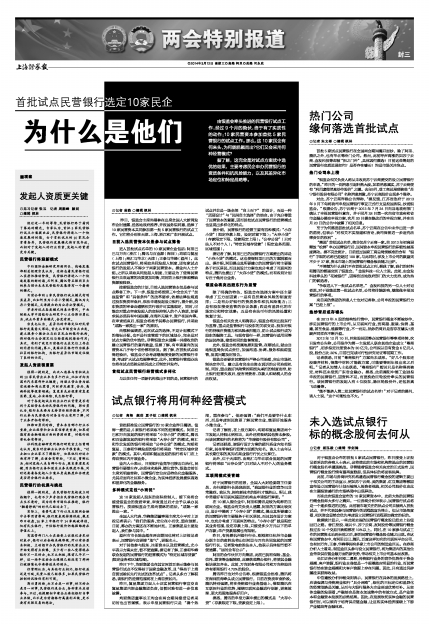 昨日,银监会主席尚福林在出席全国人大新闻发布会时透露,经各地政府推荐,并报国务院同意,选择了10家民营资本共同参加第一批5家民营银行的试点工作。它们将分别在天津、上海、浙江和广东开展试点。