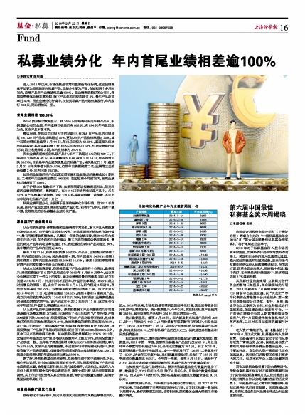 进入2014年以来,市场依然是非常明显的结构化行情,这也使得操盘手法更为灵活的阳光私募产品,业绩分化更为严重,在短短两个多月时间内,首尾产品年内业绩就相差逾100%。在业绩表现较好的公司中,泽熙投资整体业绩非常抢眼,旗下产品年内回报均超过8%,最牛产品收益率近40%。而在业绩分化行情中,权益类私募产品开始密集发行,年内发行264只,同比增加近一倍。