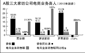同样,罗莱家纺的电商业务也十分喜人。公司董秘田霖告诉记者,去年罗莱家纺电商业务销售额超过3亿,同比增长超过50%,占去年营收的比重接近10%。今年,公司将通过建立O2O模式、扩大网络销售平台等方式,重点发力电商业务。