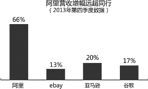阿里巴巴昨日公布的营收增幅也超过国际同行ebay和亚马逊。根据上述公司的财务报告,ebay2013年第四季度的营收增速为13%,亚马逊的同期增速则是20%。而谷歌的2013年四季度的营收增速则为17%。